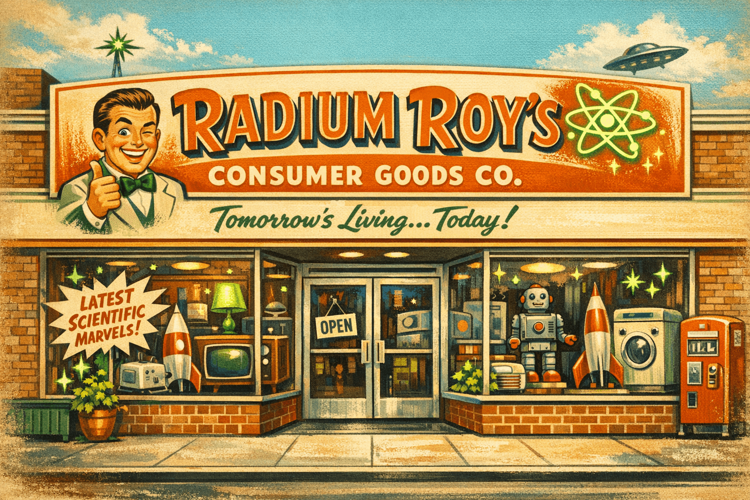 For seventy-four years, Radium Roy's has stood for the simple American belief that the modern family deserves more — more flavor, more brightness, more glow. From the moment you bring home your first jar of Granny's Aflatoxin-Aged Peanut Butter to the day you install your very own Radon Cellar Concentrator, you'll feel the Radium Roy's difference.